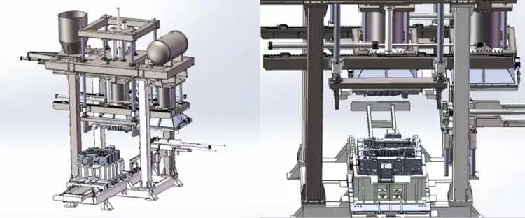 Alsó penész bejárat → penész zárás [lefelé irányuló nyomás] → kombinált modul bejárat [mag-húzó modul] → homok befecskendező fej bejárata → homok befecskendező fej lefelé irányuló nyomás → homok befecskendezése → homok befecskendező fej kipufogógáz-kipufogó